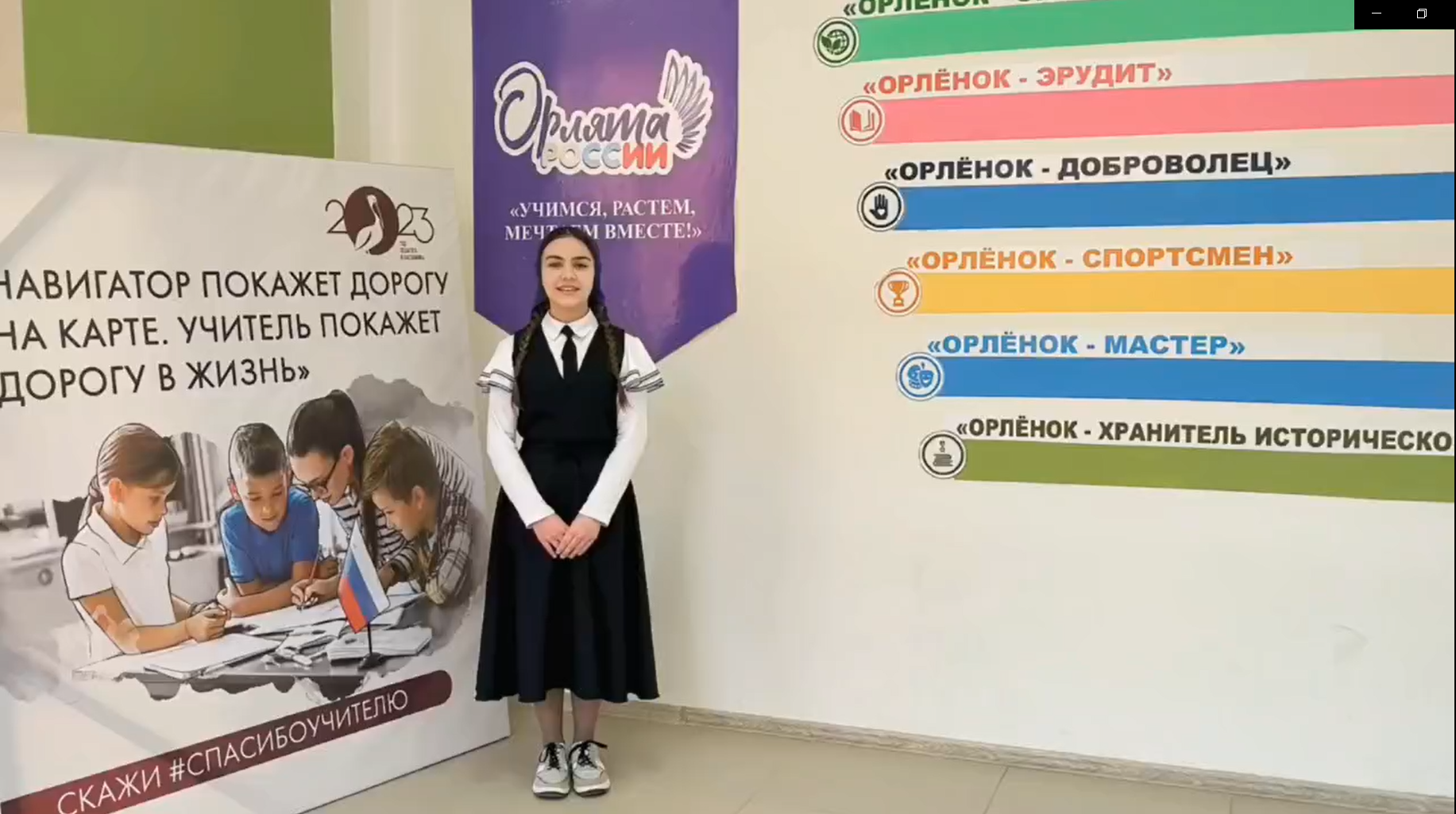 29.11.20232023 год Указом Президента России Владимира Путина объявлен Годом педагога и наставника. В рамках Года педагога и наставника ученица 7"Б" класса Дебзиева Селима приняла участие в акции "Спасибо учителю"